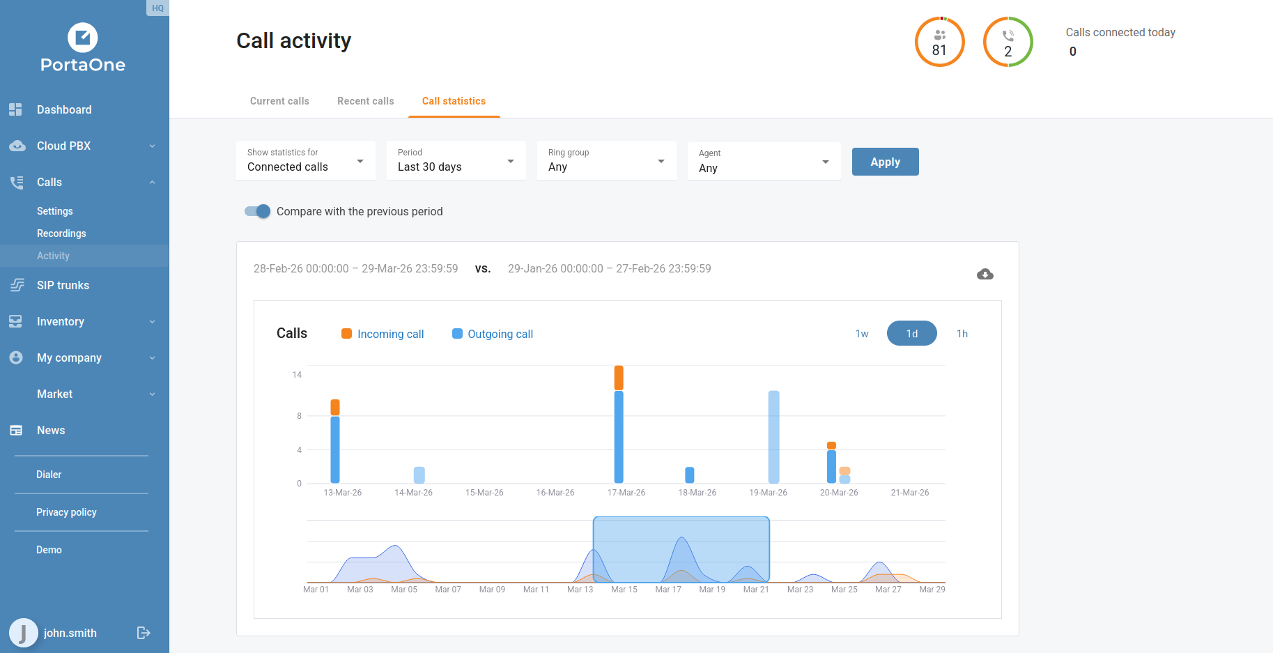 The Call activity → Call statistics view has been enhanced with a metric selector. Four options are now available: Connected calls, Talk time, Hold time, and Wrap up time. Combined with the existing period filter and ring group filter, businesses can now build a much more targeted picture of queue and agent performance without leaving the portal.