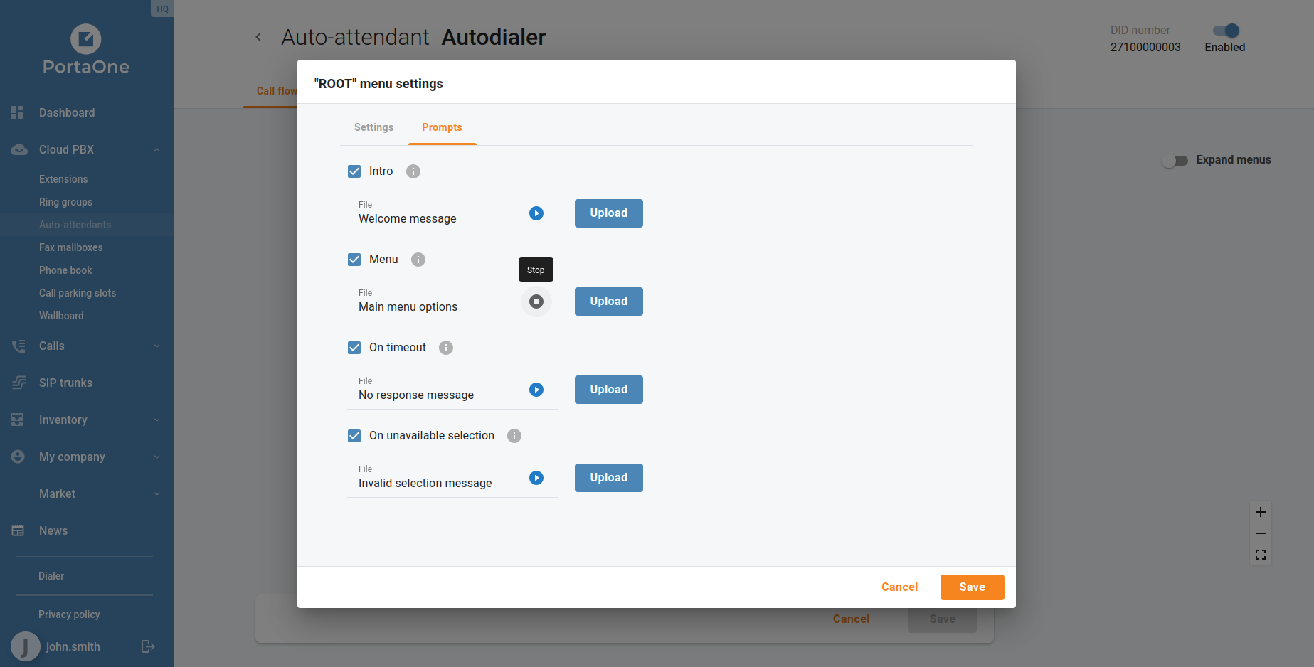 IVR prompts can now be played back directly inside the portal without downloading the audio file. When editing an auto-attendant, each configured prompt displays an inline audio player, letting businesses verify the correct greeting, menu announcement, or error message is in place before it reaches callers. This replaces the previous workflow of downloading the audio file and opening it in a separate player.