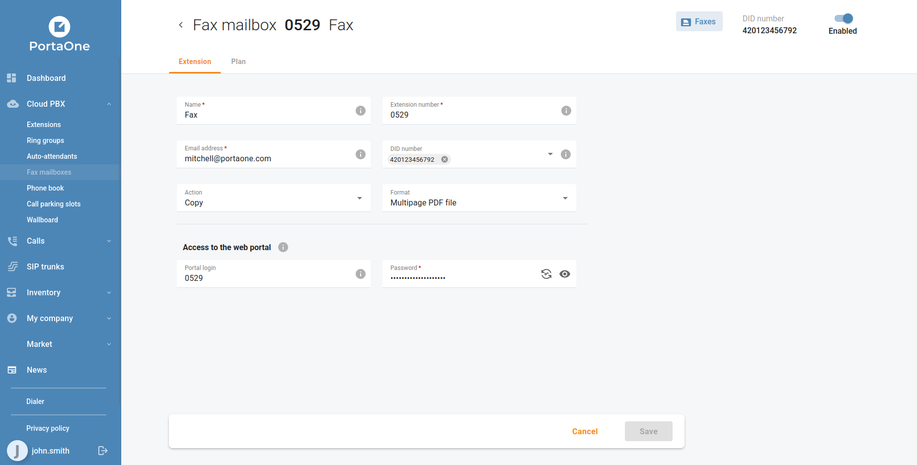 Customers can now browse, preview, and manage their incoming faxes directly from the portal. Fax messages are accessible from the fax mailbox, complete with document preview and download — no third-party email client required. Fax mailboxes are managed from the Cloud PBX → Fax mailboxes and Cloud PBX → Extensions menus, and can be assigned to DID numbers as needed.