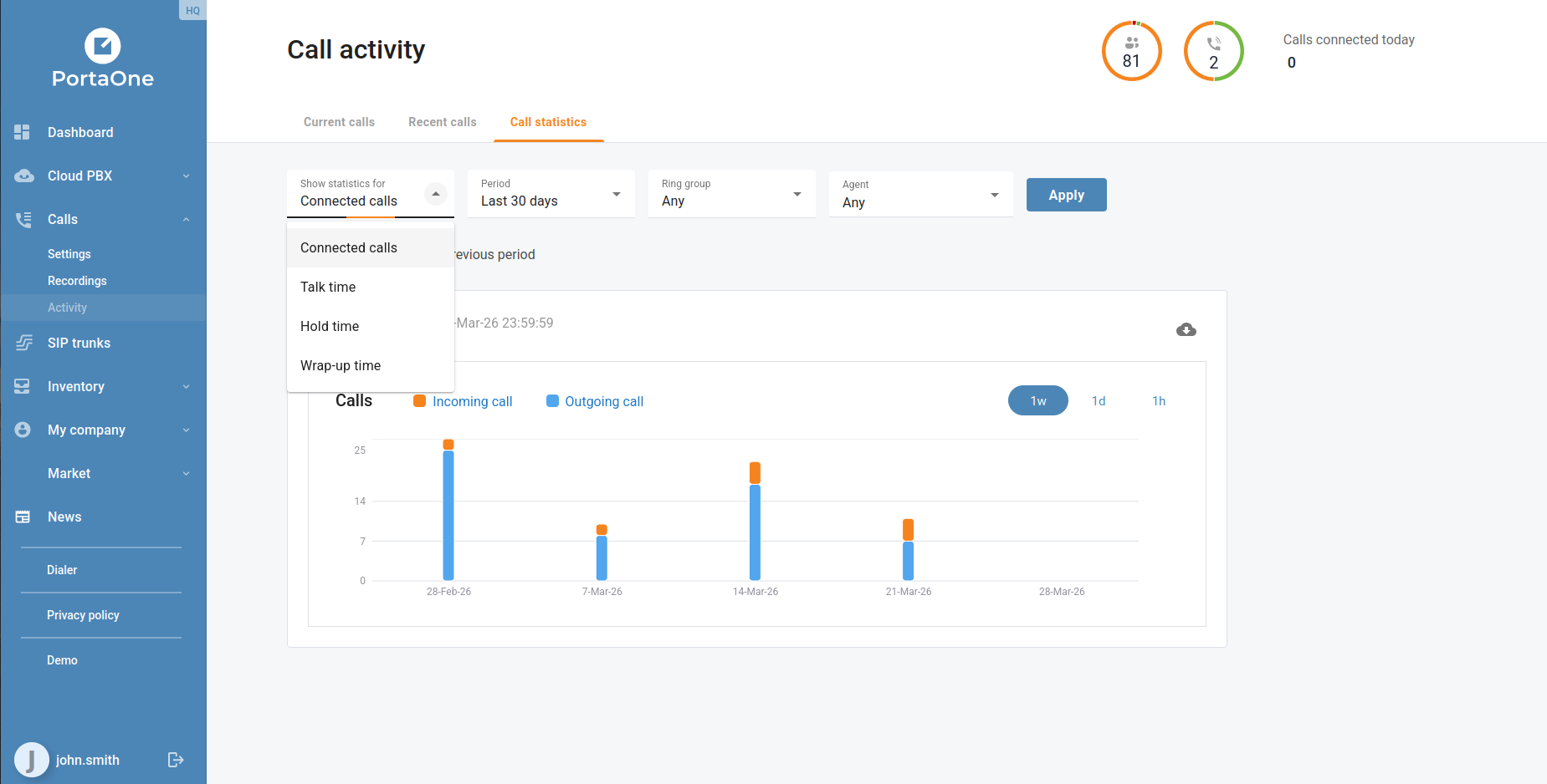 The Call activity → Call statistics view has been enhanced with a metric selector. Four options are now available: Connected calls, Talk time, Hold time, and Wrap up time. Combined with the existing period filter and ring group filter, businesses can now build a much more targeted picture of queue and agent performance without leaving the portal.